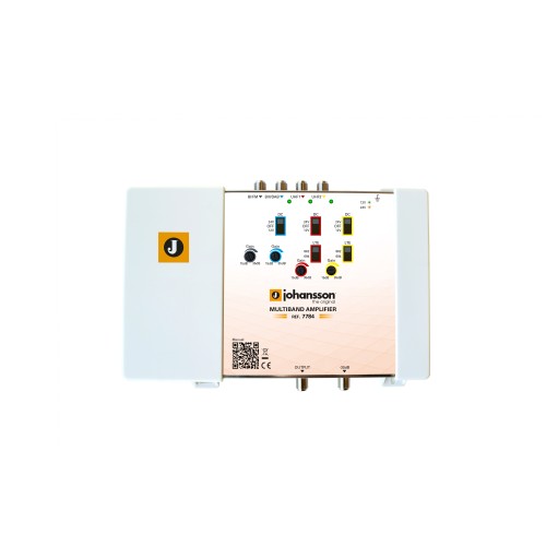 Johansson 7784 is a high output power distribution amplifier (BI/FM, BIII/DAB, UHF1, UHF2) with separate gain adjustments, DC selection and LTE selection. The RED compliant amplifier is fully LTE-ready and have a high gain. This ensures a perfect signal quality throughout the building. This amplifier is far more efficient than its predecessor.