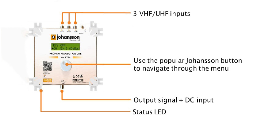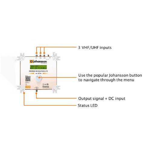 Johansson KIT 6714 Profiler Revolution is an easy to use programmable filter amplifier and convertor for terrestrial signals. The module optimizes terrestrial VHF/UHF and FM signals from multiple inputs with the goal to provide high quality images on your TV screen. The state-of-the-art programmable filter amplifier has no equivalent on the market due to its revolutionary technology.