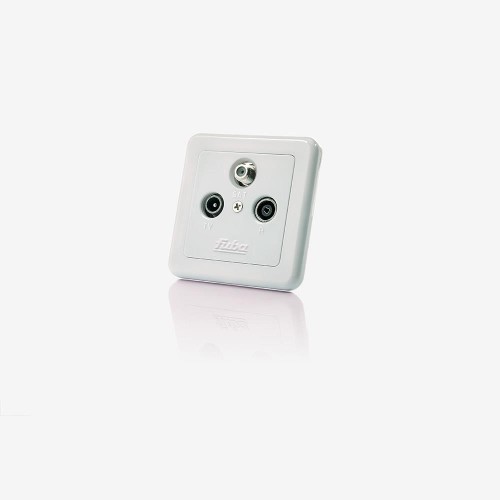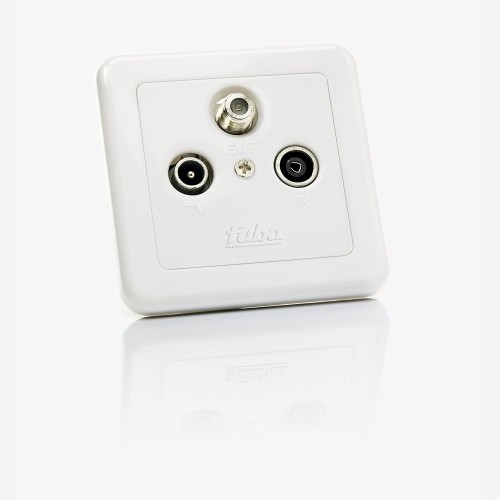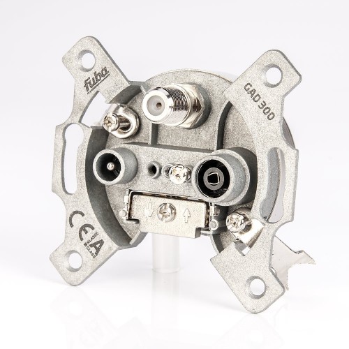 The Fuba GAD 300 is a terminal socket with three separate outputs: IEC plug for TV, IEC socket for radio and F socket for satellite. The single box consists of a high-quality metal pressure housing and is accordingly robust. It is pearl white and can be installed optimally and unobtrusively in walls thanks to the cover plate. Once installed, the antenna socket works long-lasting in the highest quality.