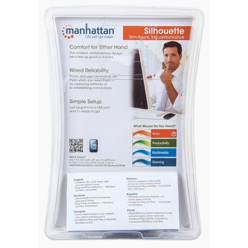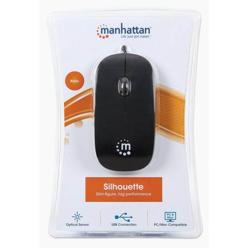 The Manhattan IM 900-U-SLB is a functional and accurate USB visual mouse, equipped with 3 buttons and a vertical scroll wheel, adjustable resolution: 10000 dpi, suitable for use with right and left hand. The flat surface and the ergonomic, ambidextrous design offer a comfortable grip reducing fatigue. Plug & Play: no installation required. Mac and Windows compatible.