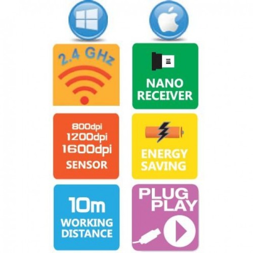 The Techly IM 1600-WT-BGW is a functional and accurate 2.4GHz wireless optical mouse with frequency receiver, adjustable resolution: 800-1200-1600 dpi, suitable for use with right and left hand. Plug & Play: no installation required, maximum operating distance 10 m.