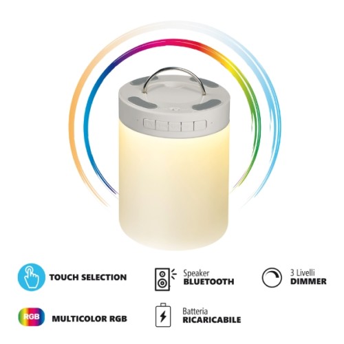 Dancy, RGB lamp includes bluetooth speaker, touch option and battery. It can be used both as a night light in the bedroom and as a small lantern. It is equipped with a handle at the bottom, useful for easy carrying everywhere. Thanks to the Bluetooth speaker you can listen to your playlist and the music function makes the light dance to the beat of the music, making the atmosphere pleasant and fun.