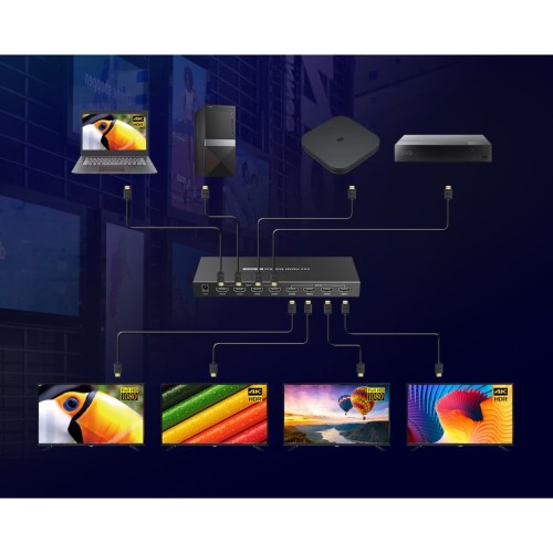 • Share up to four HDMI sources between four displays.