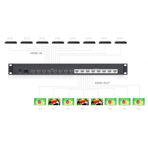 • Supports 8 HDMI inputs and 8 HDMI outputs.