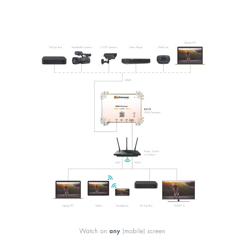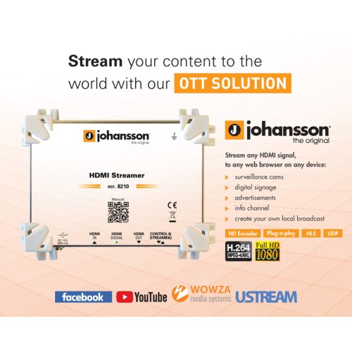 The Johansson 8210 is designed for small to medium-sized projects. It is a High Definition Video and Audio Encoder that makes it easy to put your HDMI source on a (local) network and/or internet. This gives the end-user the flexibility to see your real-time video content on their preferred (mobile) device: smartphone, tablet, laptop or TV. The end-user can simply surf to a dedicated webpage or streaming service. No need to install a mobile application or additional software, it works on any web browser.