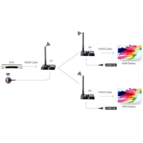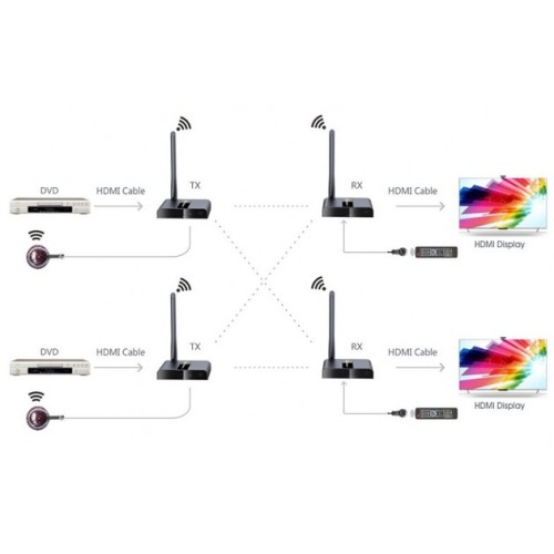 The Techly IDATA HDMI-WL88M Wireless HDMI extender allows you to transmit and extend the HDMI signal up to 50 meters wirelessly, with a powerful anti-interference capability with a 5 GHz operating frequency. It supports point-to-point delivery (1 Trasmitter and 1 Reicever not included), but also one to many (from 1 to 2) and multiple to many (2 to 2, 2 to 1) configurations. IDATA HDMI-WL88M supports a wide-band IR 20-60 KHz bandwidth to achieve radio remote control of source devices on the receiver side. With the two control buttons and the IR controller, it easily makes the channel setup. It is an excellent solution for transmitting one or more HDMI source signals on one or more simultaneous simultaneous wireless displays, ideal for conferences, home entertainment and education applications, etc.