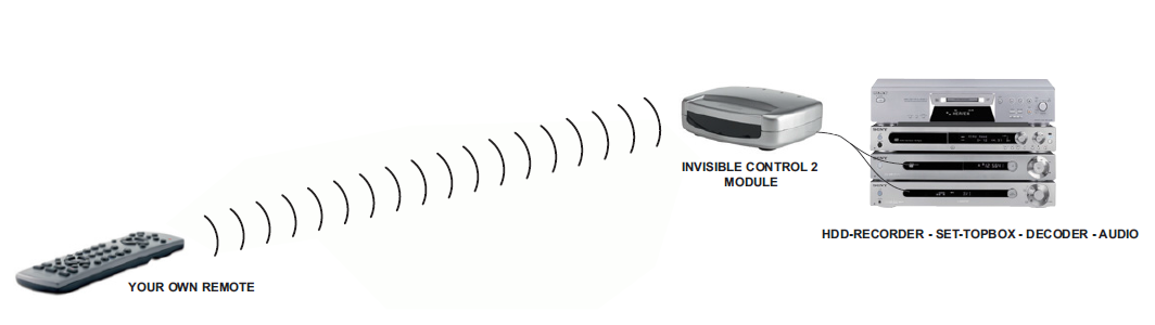 Place the Invisible Control 2 within sight, on or below the cabinet that the A/V equipment is in. Stick the IR LEDs on the IR eye of your equipment and then wire these to the Invisible Control 2™. The Invisible Control 2™ now receives the signal from your own remote control and transmits it to the IR LEDs connected to your equipment. You can now use your own remote control to operate your equipment while it is still placed in a closed cabinet.