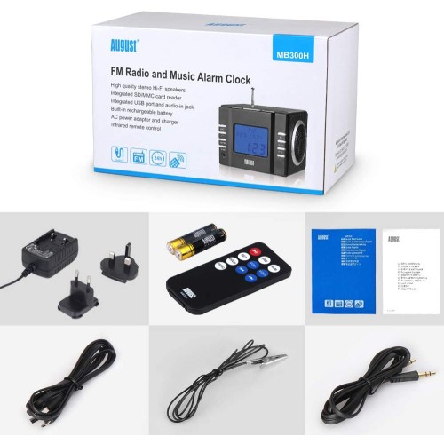 1x August MB300H - Mini MP3 Musicbox with FM Clock Radio Black (and Batteries)