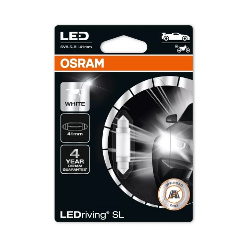 LEDriving SL C5W replacement lamps offer a modern and intense light. These replacement lamps are suitable for all conventional C5W lamp bases. In comparison to standard lamps, these LED retrofit lamps use up to 80% less energy. OSRAM offers a 4 year guarantee for these LEDriving SL lamps.
