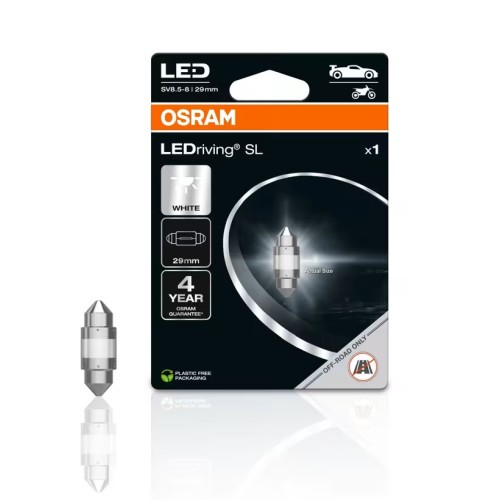 LEDriving SL C5W replacement lamps offer a modern and intense light. These replacement lamps are suitable for all conventional C5W lamp bases. In comparison to standard lamps, these LED retrofit lamps use up to 80% less energy. OSRAM offers a 4 year guarantee for these LEDriving SL lamps.