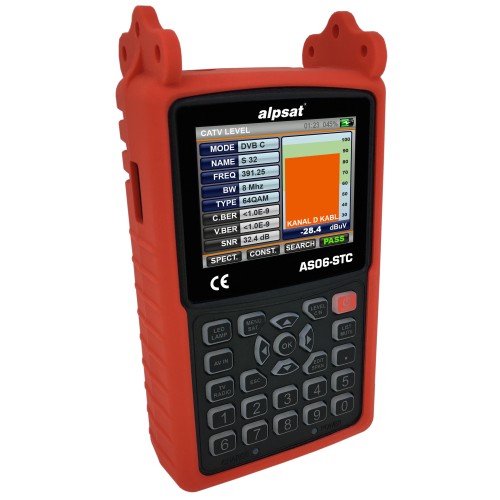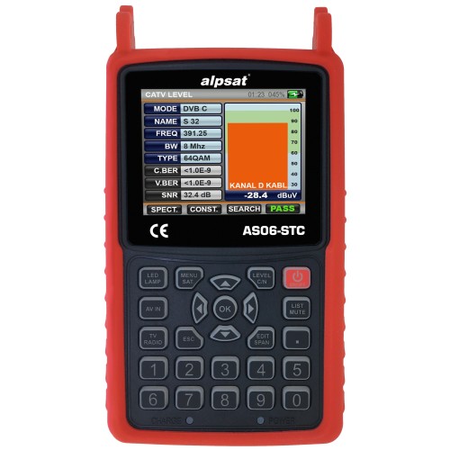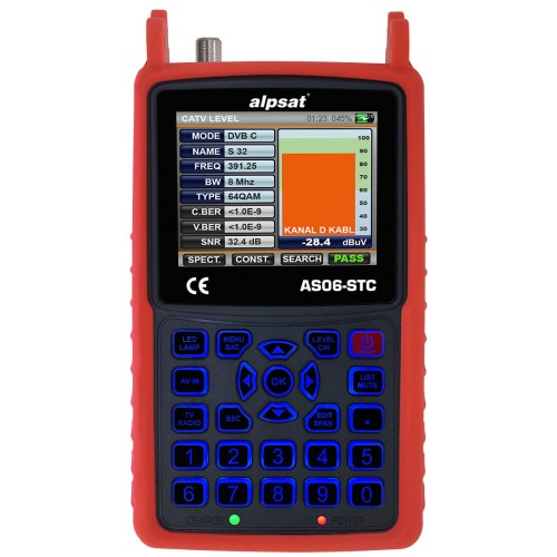 Alpsat AS06-STC is a combo hand instrument that covers the DVB S-S2 / T-T2 / C standards, provides numerous capabilities, complete measurements, fast spectrum, direct level & quality bars with audible indication for easy centering of the dish and antenna signal optimization as well as remarkable spectrum capabilities such as carrier identification while displaying an SD / HD image across all free channels. In addition to the known measurement and spectrum functions, we have constellation indications, along with measurements such as C / N, MER, bBER, level and quality bars, digital data, and transponder switching for direct control. With TP Control, we have a four-transponder bar code per satellite or dual display for 8 transponders from 2 satellites, eg from 2 LNBs simultaneously or from a multiswitch.. With the Multilevel control, we have a transponder for 2 LNBs, such as Monoblock LNB or even a multiswitch. With the Multilevel control, we have a transponder for 2 LNBs, such as Monoblock LNB or even a multiswitch. With Auto Port Search, the instrument tells you which satellite corresponds to which DiSEqC (Auto DiSEqC) door. The instrument features a 3000mAh 7.4V lithium-ion rechargeable battery that can be replaced and provides 4 hours of autonomy depending on the use.