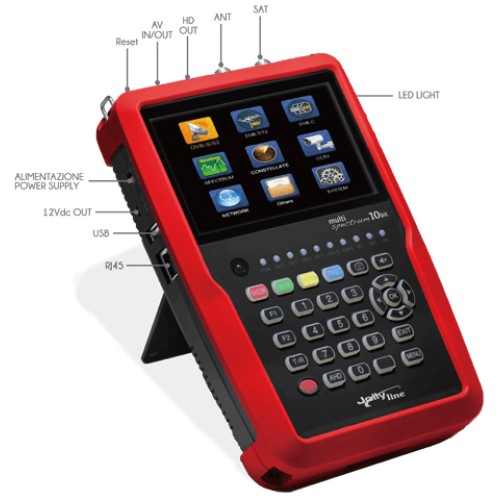 The Jolly line 43986 is a professional instrument 10bit for the correct positioning of the antenna (DVB-T and DVB-T2), of the parabola (DVB-S and DVB-S2 also with SCR Unicable) and DVB-C (optical fiber). Also it is a measuring instrument, professional signal meter for satellite and digital terrestrial and optical fiber with 5.0 "screen, aiming / camera control function including AHD and LAN network test.