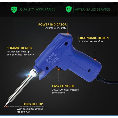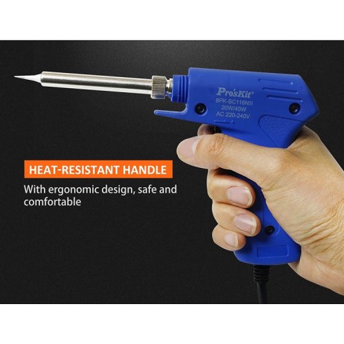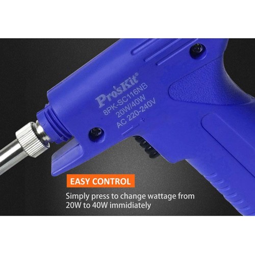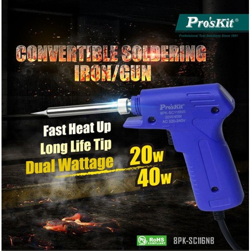Proskit 8PK-SC116NB is a 20W/40W dual power direct heating  convertible soldering iron/gun. For a wide range of applications from sheet metal to PC board. With long life tip.