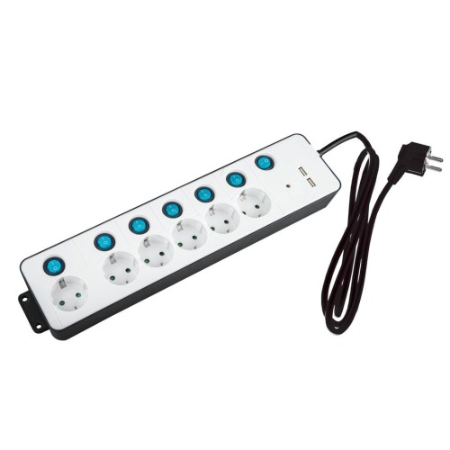 RP Safety multi-socket with 6 Schuko sockets, 1.5m long power cable, with 6+1(Main device switch) ON/OFF switches and built-in safety for children. Protection of connected devices from overvoltage as well as 2 USB sockets.