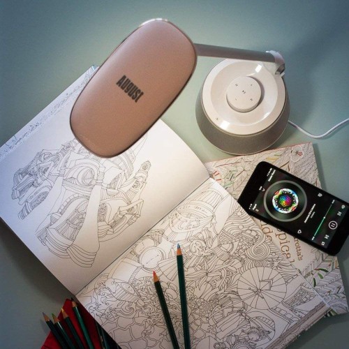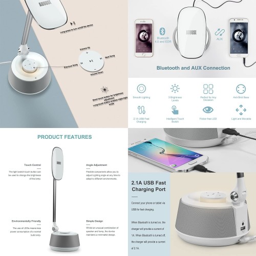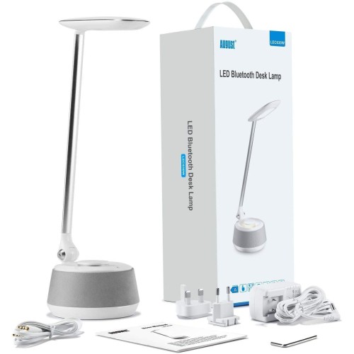 The August LEC630 - LED Bluetooth Speaker Desk Lamp is a Low Consumption Led Lamp with many functions such as Brightness Touch Control, Built-in Bluetooth Speaker to listen to your favourite Playlists, Integrated USB Charging Port to Charge your Phone or Tablet and Warm Night-Light Function.