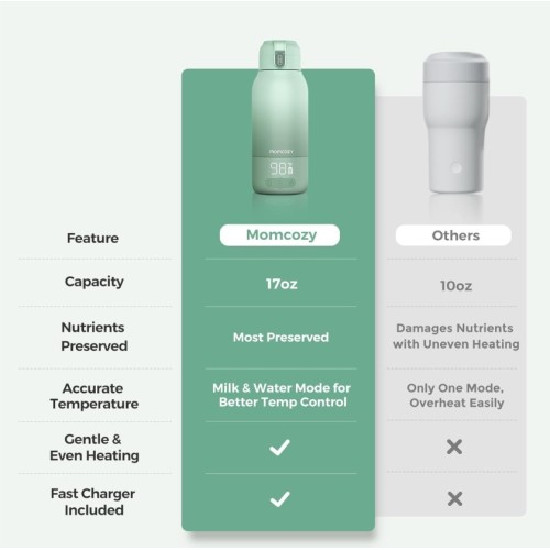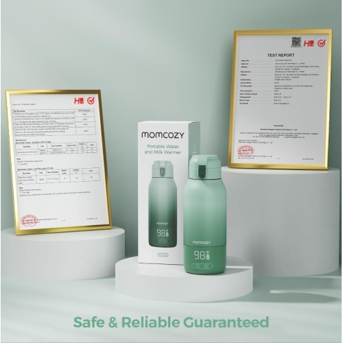 Momcozy's portable bottle and water warmer, designed for quick and safe heating of breast milk or water on the go. Ideal for travel, walks and use outside the home, offering instant meal preparation for baby with temperature accuracy and long battery life.