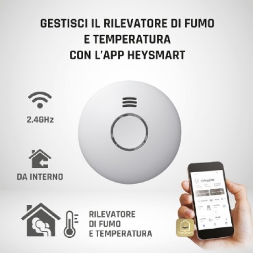 HEY SMOKE is a photoelectric smoke detector, powered by two AA alkaline batteries. Photoelectric technology gives greater sensitivity to the detection of slow-burning fires, with thick, black smoke, characterized by little heat and which can burn for hours before generating flames. HEY SMOKE does not contain material that is dangerous for the environment. It can be installed in any room (excluding the bathroom) and in any other area of ​​the house that allows occupants to hear the sound generated in the event of an alarm. In the event of a fire, the device activates the sound and light alarm (flashing red LED) and sends a notification via the App. Multiple installations allow you to adequately monitor apartments, houses on a single level or on multiple levels. In multifamily buildings, every single housing unit must have a dedicated fire alarm. Test button to check the functionality of the sensor. Installation must be carried out in compliance with local regulations. This smoke detector DOES NOT replace a complete alarm system.